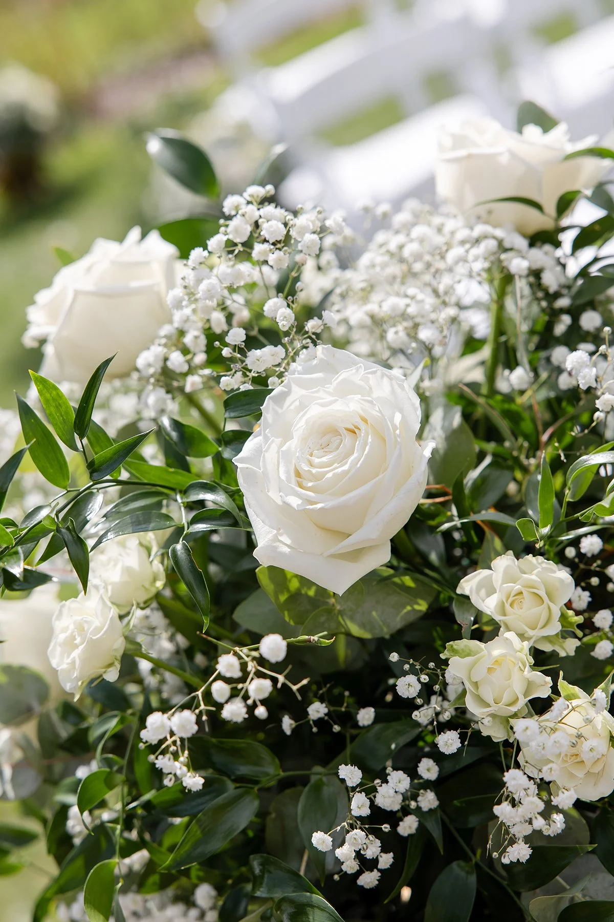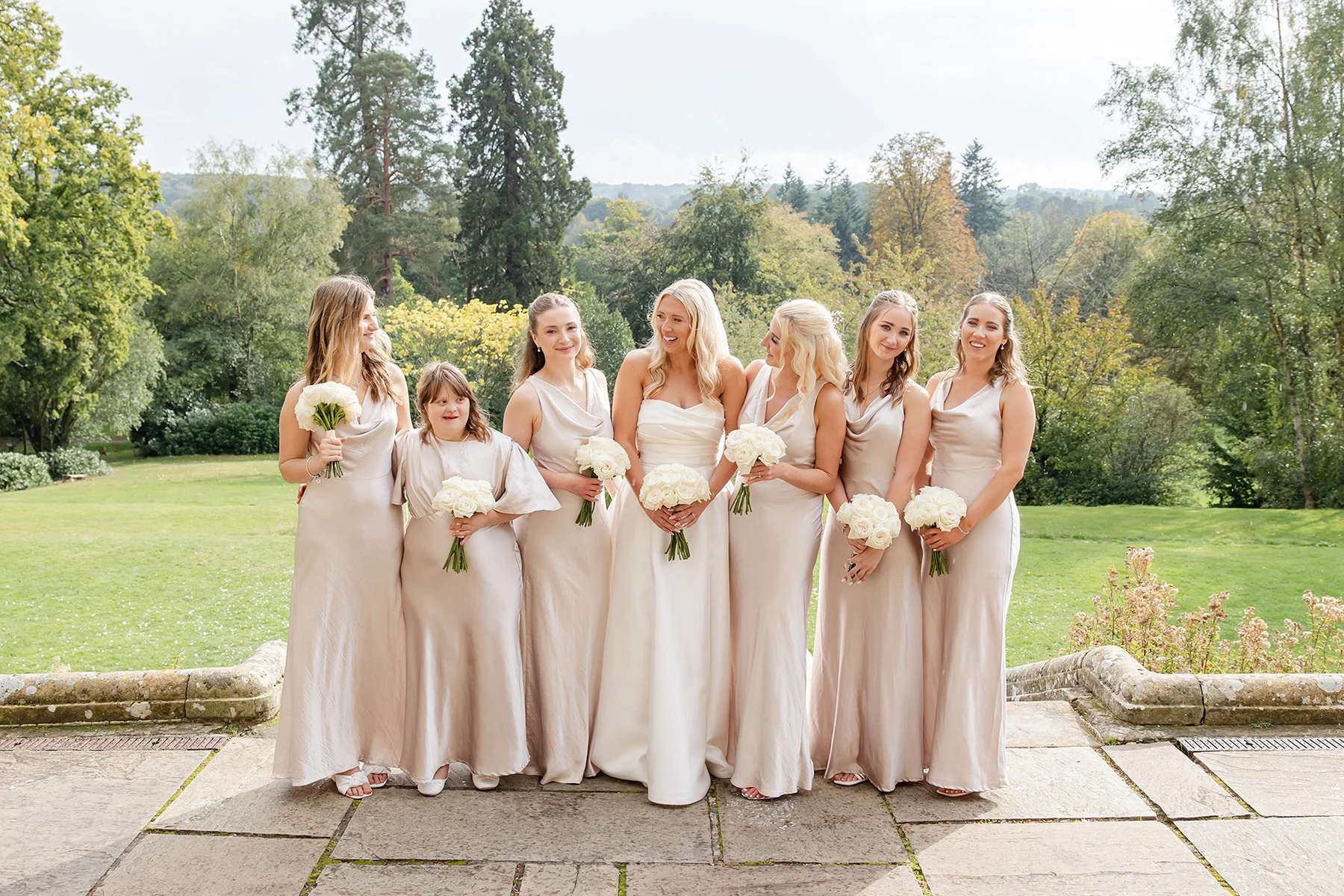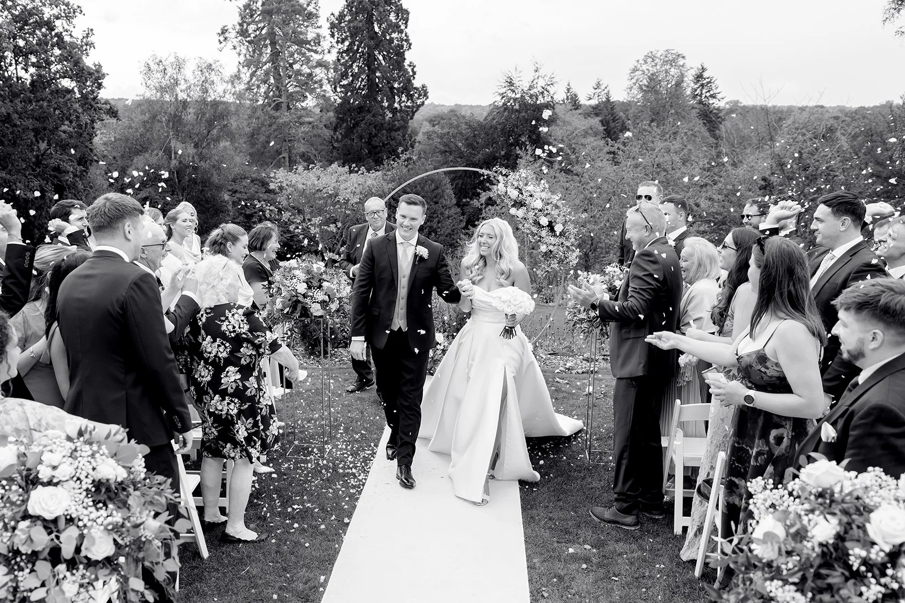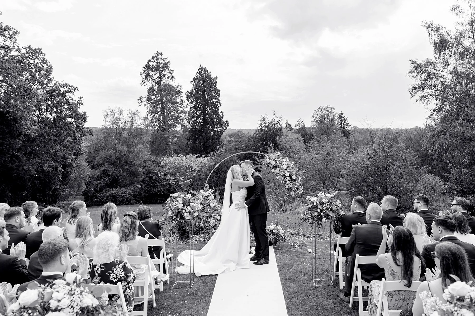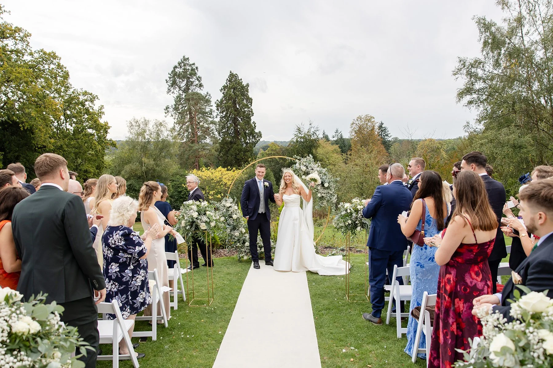 I am OBSESSED with the photos of Emily & Nick’s beautiful wedding at Salomons Estate in Tunbridge Wells! They were lucky enough to marry outside on the manicured lawns in the grounds of Salomons, overlooking a spectacular view of expansive woodlands. I loved the floral lined aisle and elegant arch, which added even more romance to their ceremony!